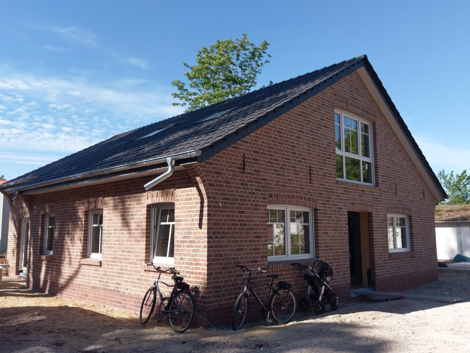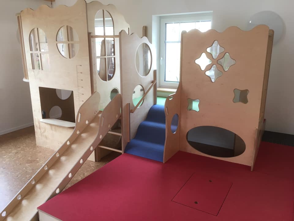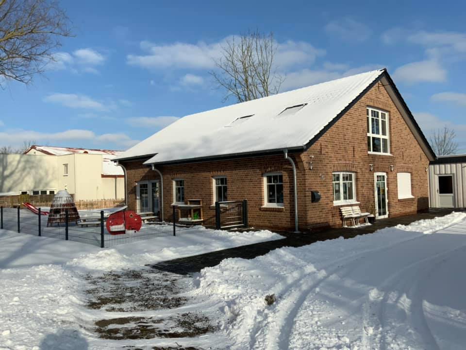 Das Gebäude für unsere Krippe hat eine Nutzfläche von 225 Quadratmetern. Es wird in Holzrahmenbauweise mit Giebeldach errichtet und mit Klinkern verkleidet. Im Erdgeschoss befinden sich ein großer Gruppenraum und ein Ruhezimmer sowie abgetrennte Bereiche für Küche, Garderobe und Toiletten. In der oberen Etage werden Büro- und Personalräume untergebracht.